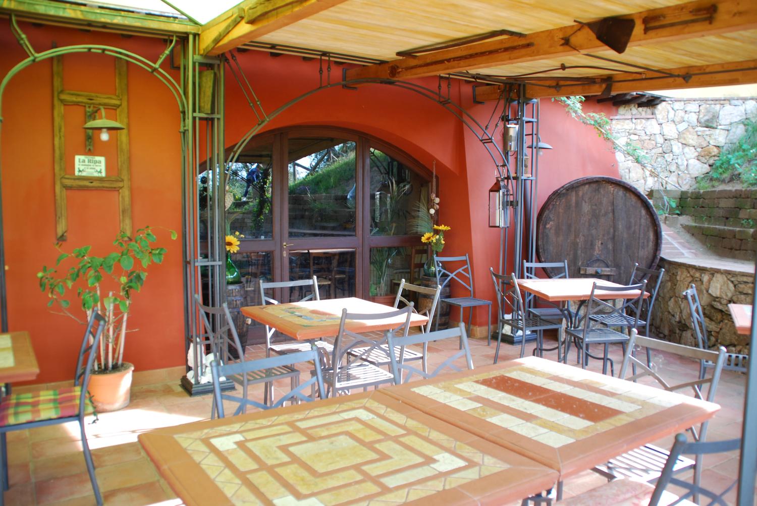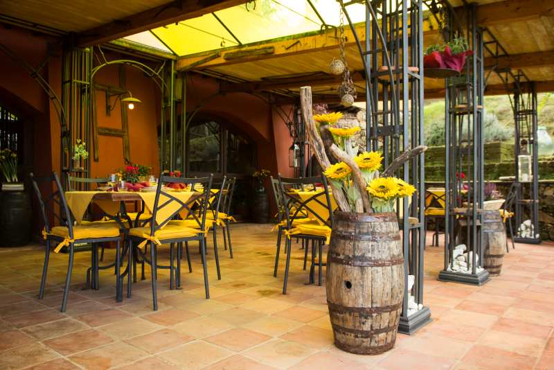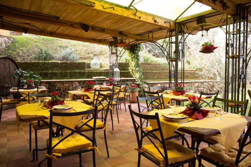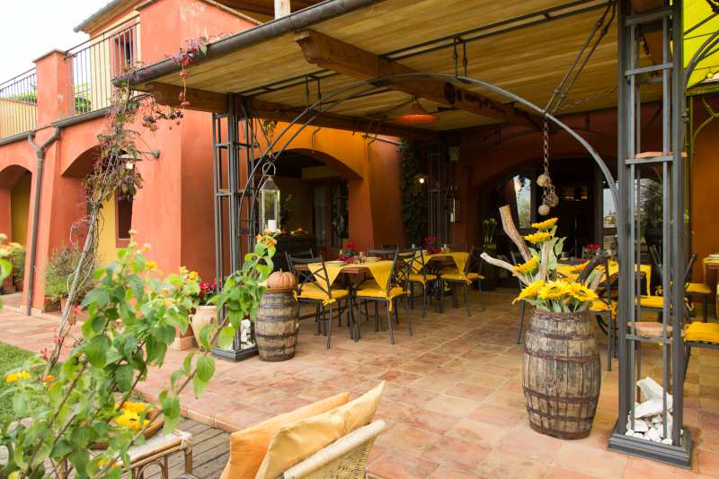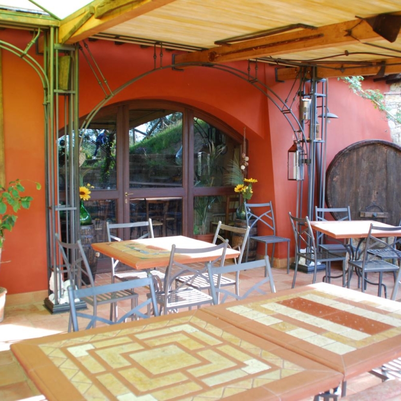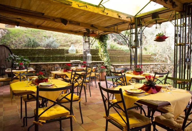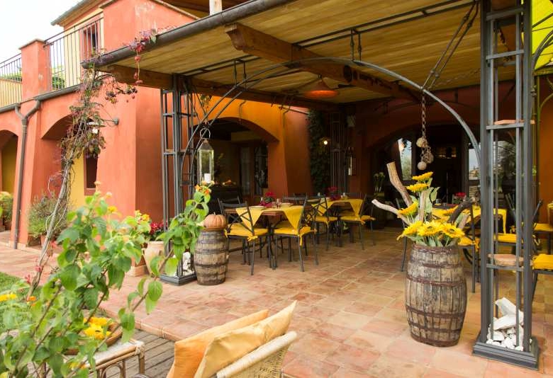 Das Innere des Restaurants ist in perfektem toskanischem Stil gehalten und verfügt über einen charakteristischen Weinkeller und einen Entspannungsbereich mit einem großen, malerischen Kamin.