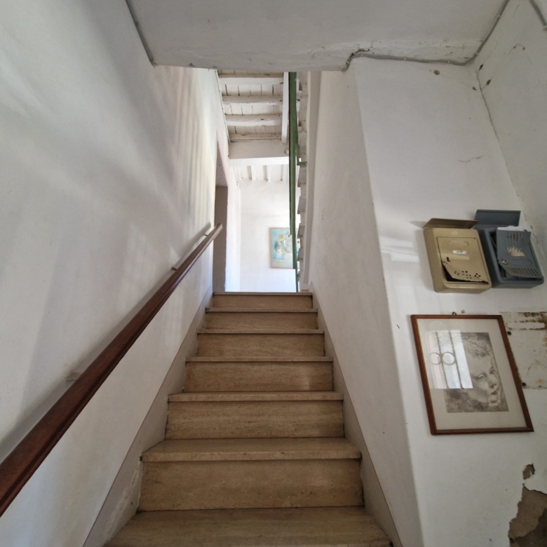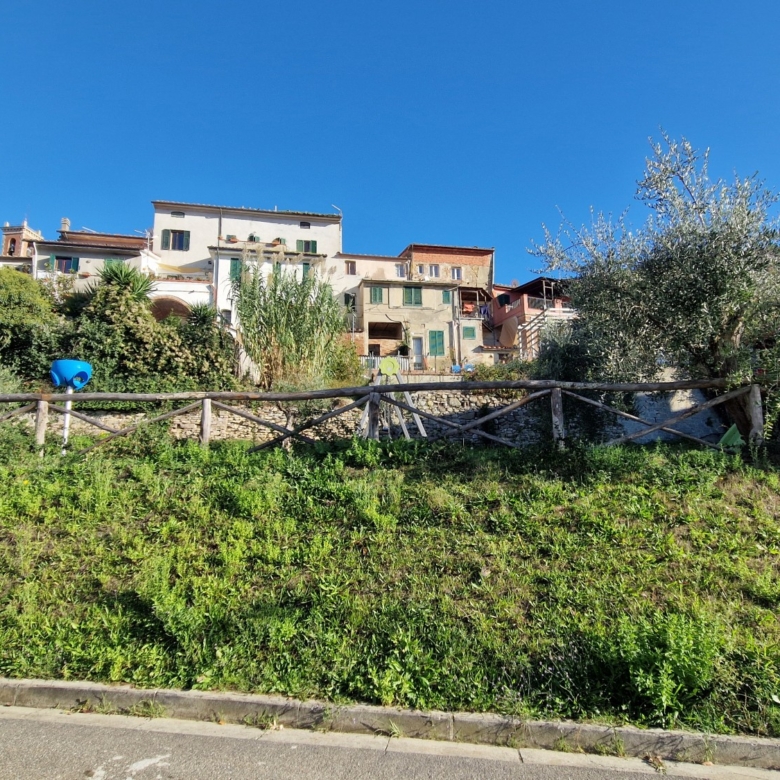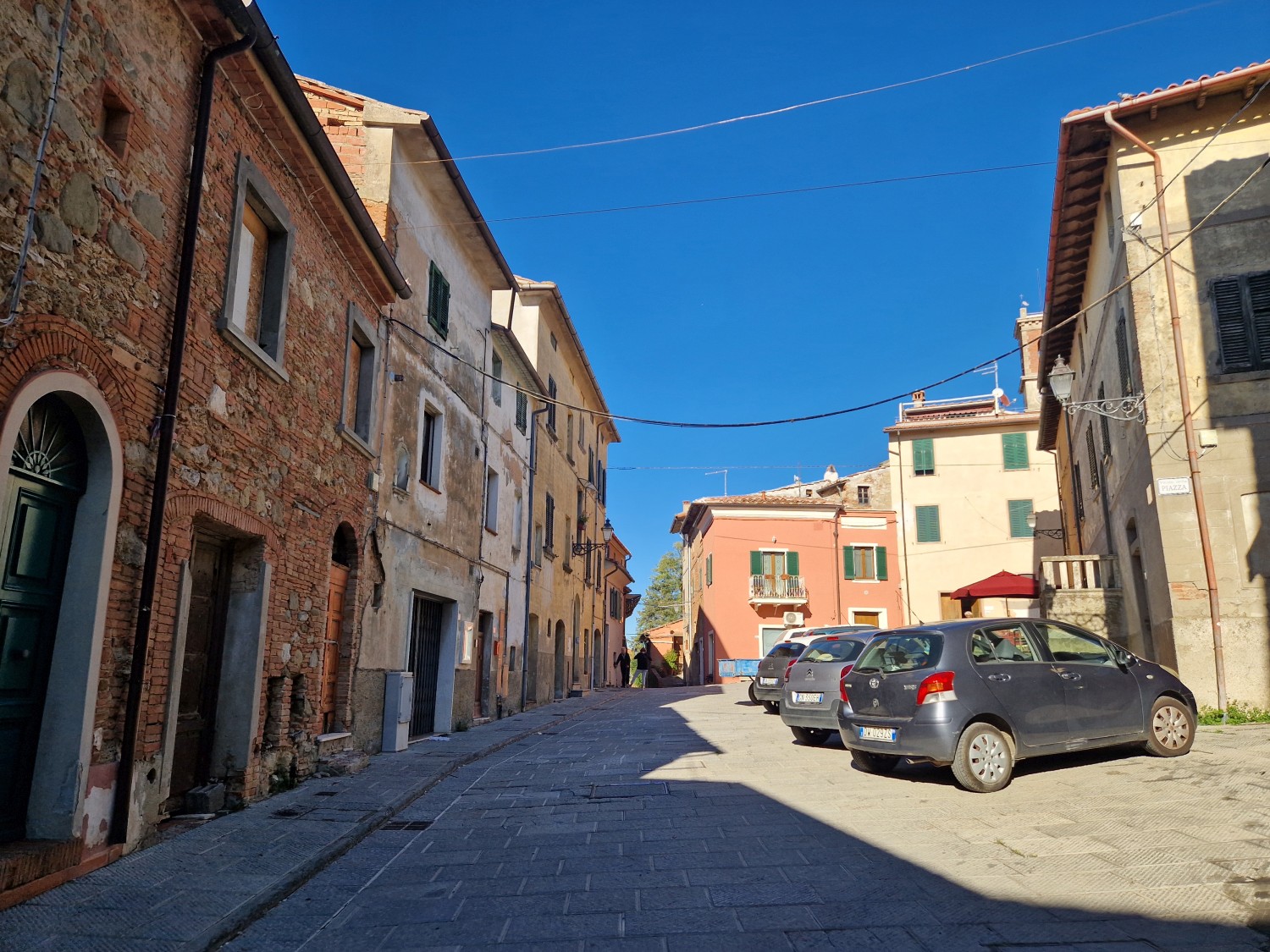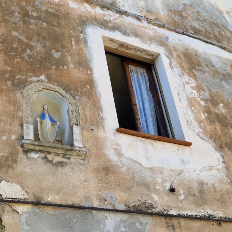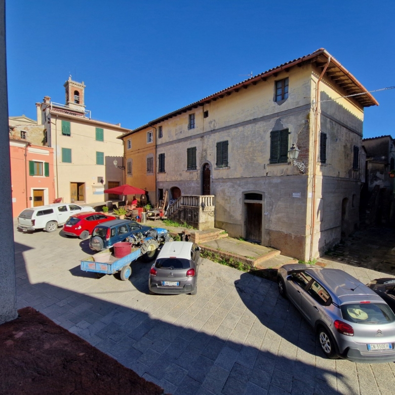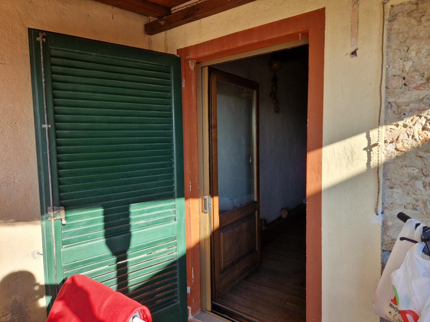 Das Haus, in dem sich die Wohnung im ersten Stock befindet, liegt sich direkt an der Piazza des kleinen Dorfes. Im Sommer findet hier das „festa dell´allegria“ statt und das ist auch das Motto dieses hübschen Dorfes. Die Fassade ist, wie man sieht, nicht restauriert.
