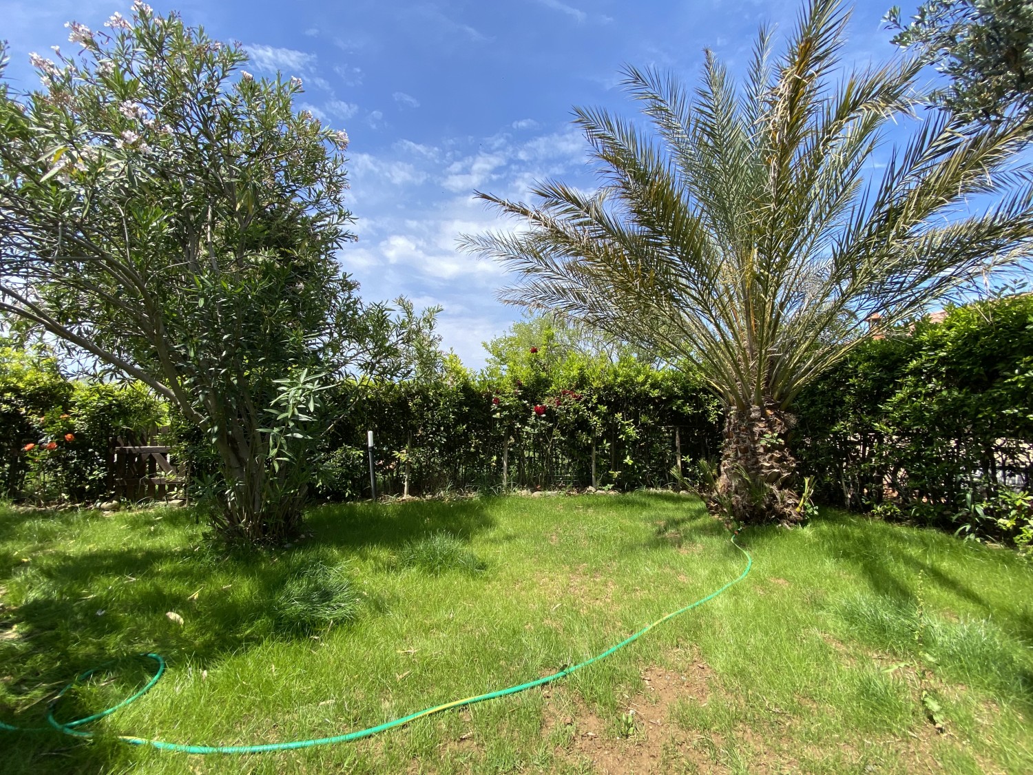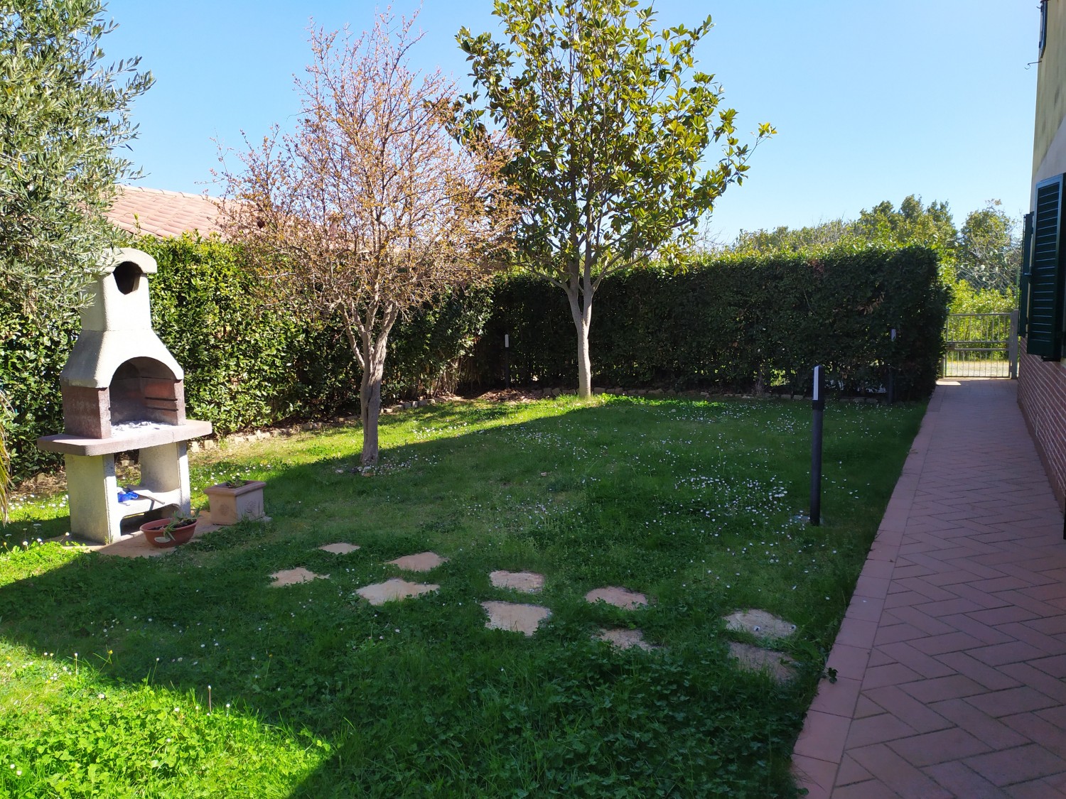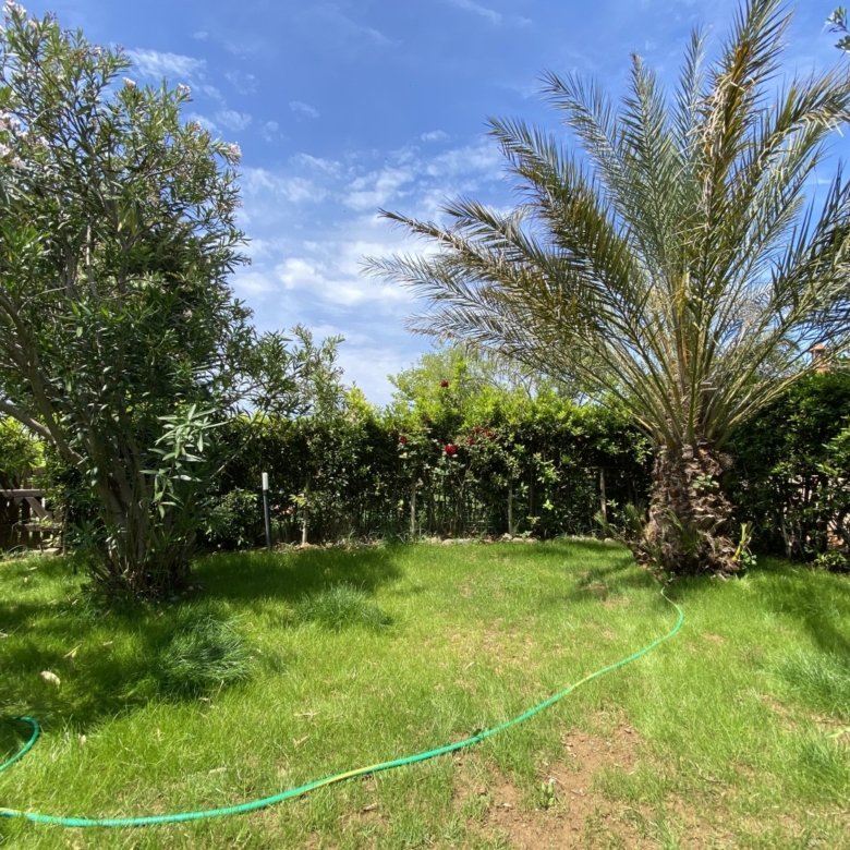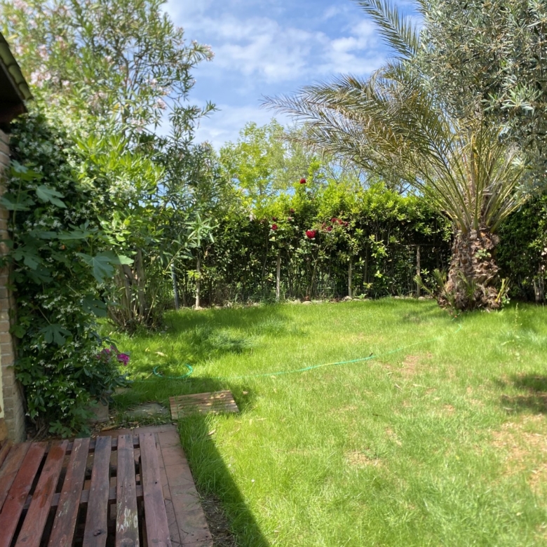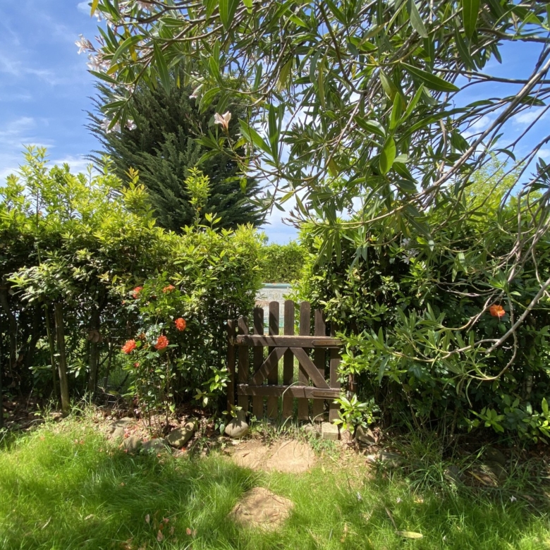 Der Garten ist von einer Hecke und einem hohen Maschendrahtzaun umgeben, damit Kinder und Haustiere spielen können. Die Wohnanlage ist geschlossen und Kinder können dort auch Fahrrad fahren. Das Haupttor führt zu einer privaten Landstraße, die mit einer Schranke verschlossen ist.
