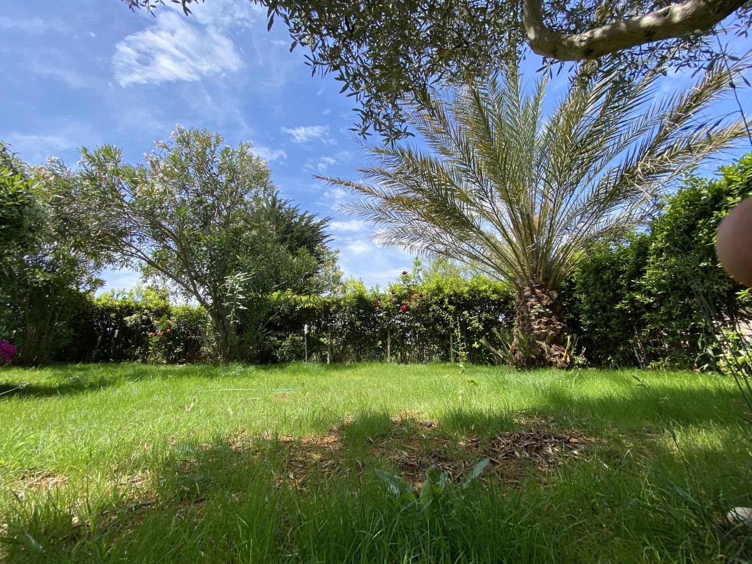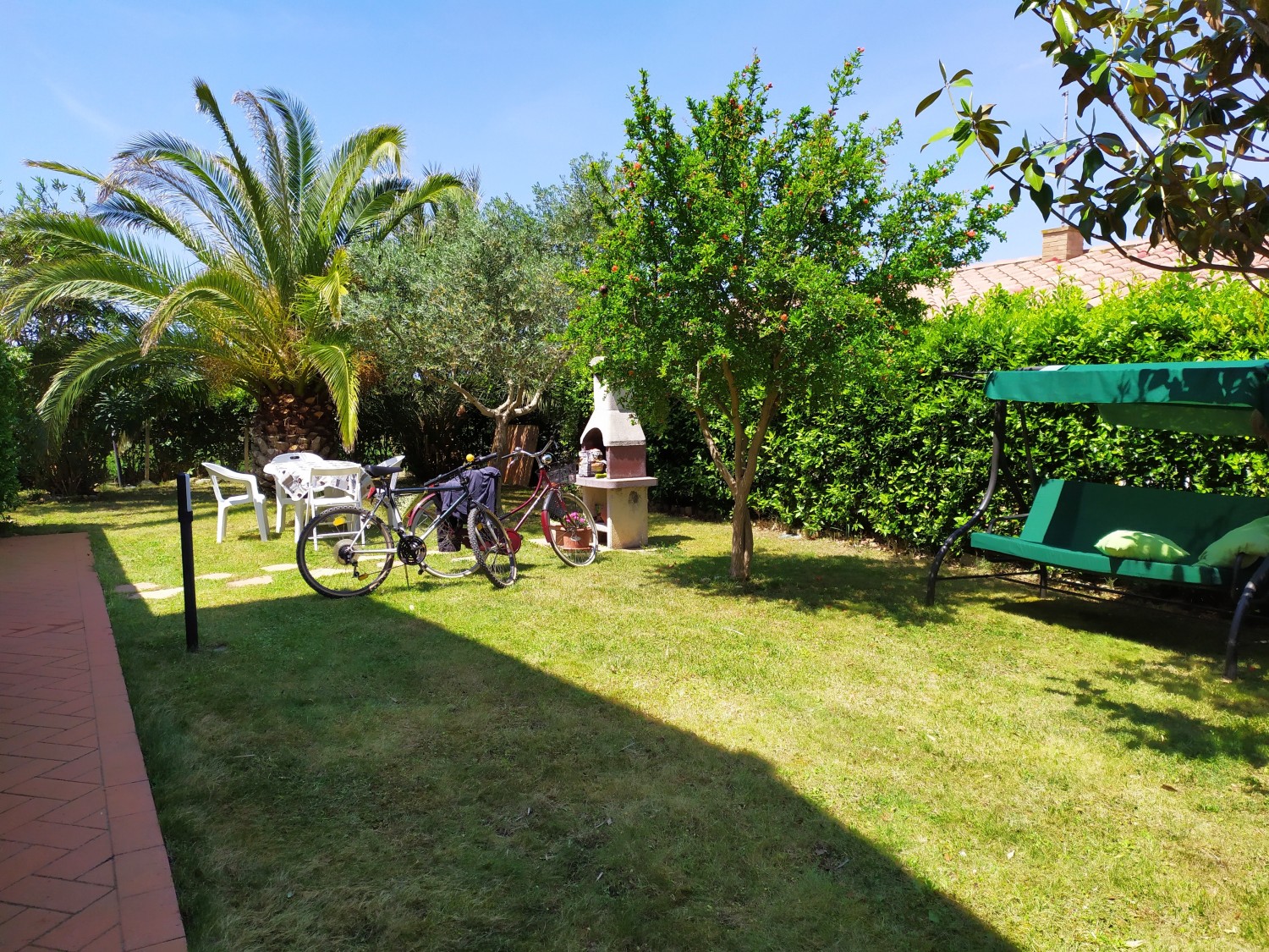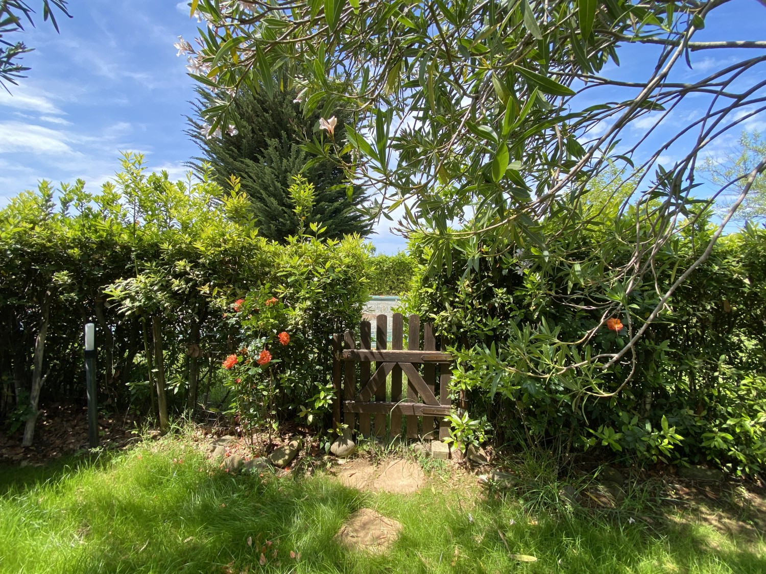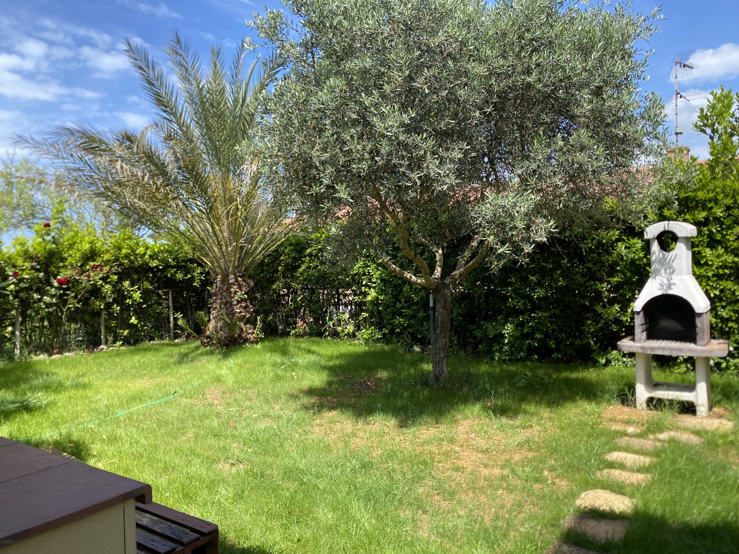 Der Garten ist von einer Hecke und einem hohen Maschendrahtzaun umgeben, damit Kinder und Haustiere spielen können. Die Wohnanlage ist geschlossen und Kinder können dort auch Fahrrad fahren. Das Haupttor führt zu einer privaten Landstraße, die mit einer Schranke verschlossen ist.