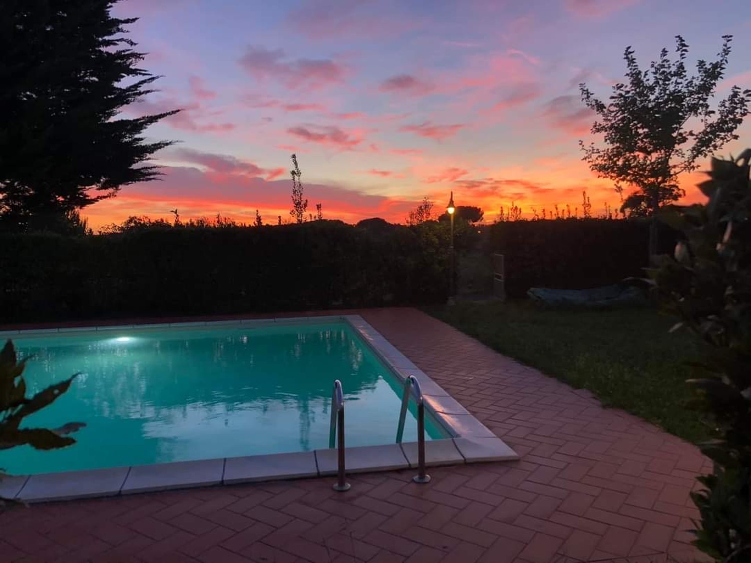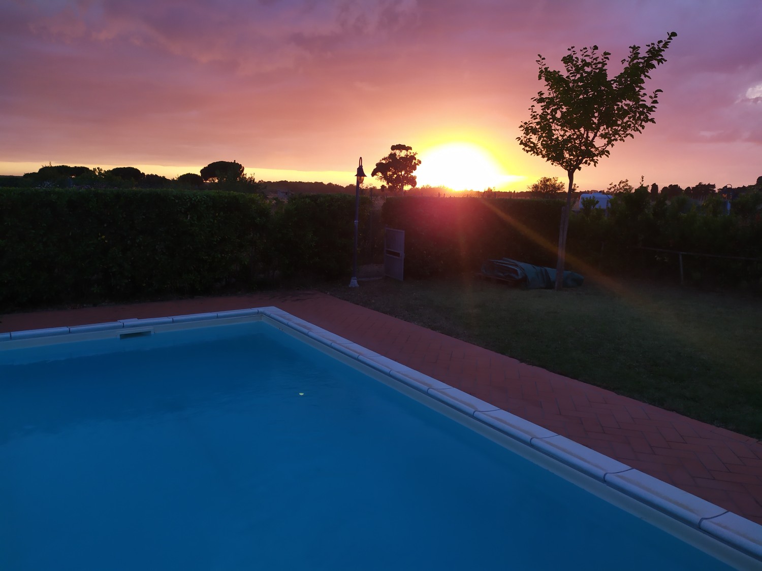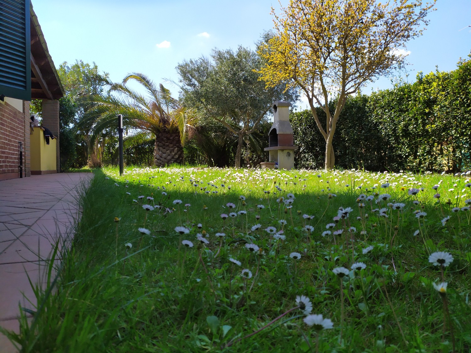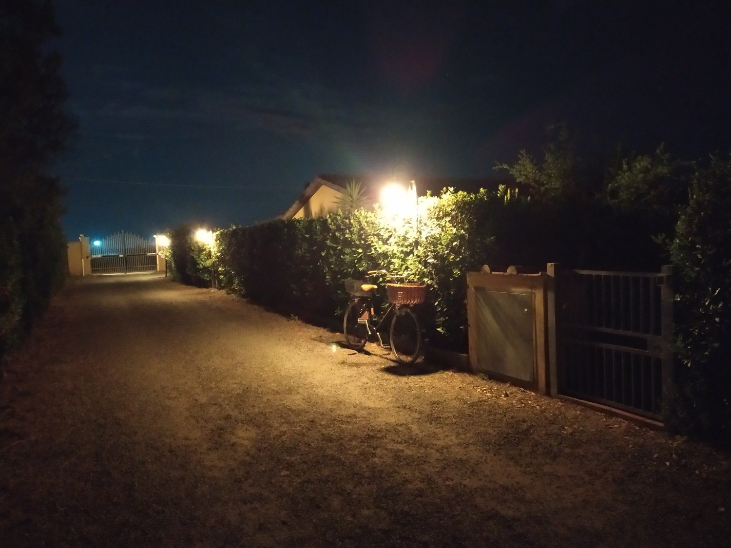 Der Garten ist von einer Hecke und einem hohen Maschendrahtzaun umgeben, damit Kinder und Haustiere spielen können. Die Wohnanlage ist geschlossen und Kinder können dort auch Fahrrad fahren. Das Haupttor führt zu einer privaten Landstraße, die mit einer Schranke verschlossen ist.