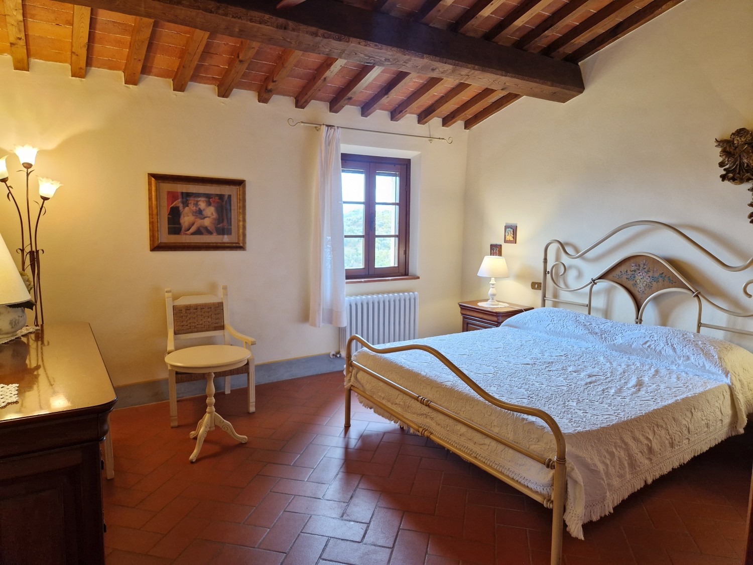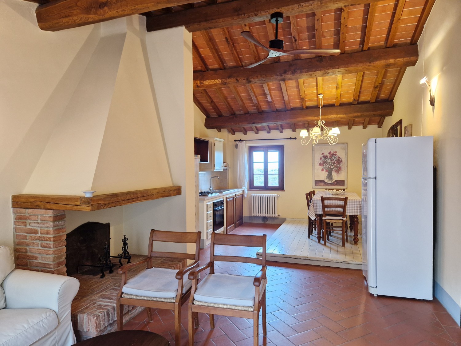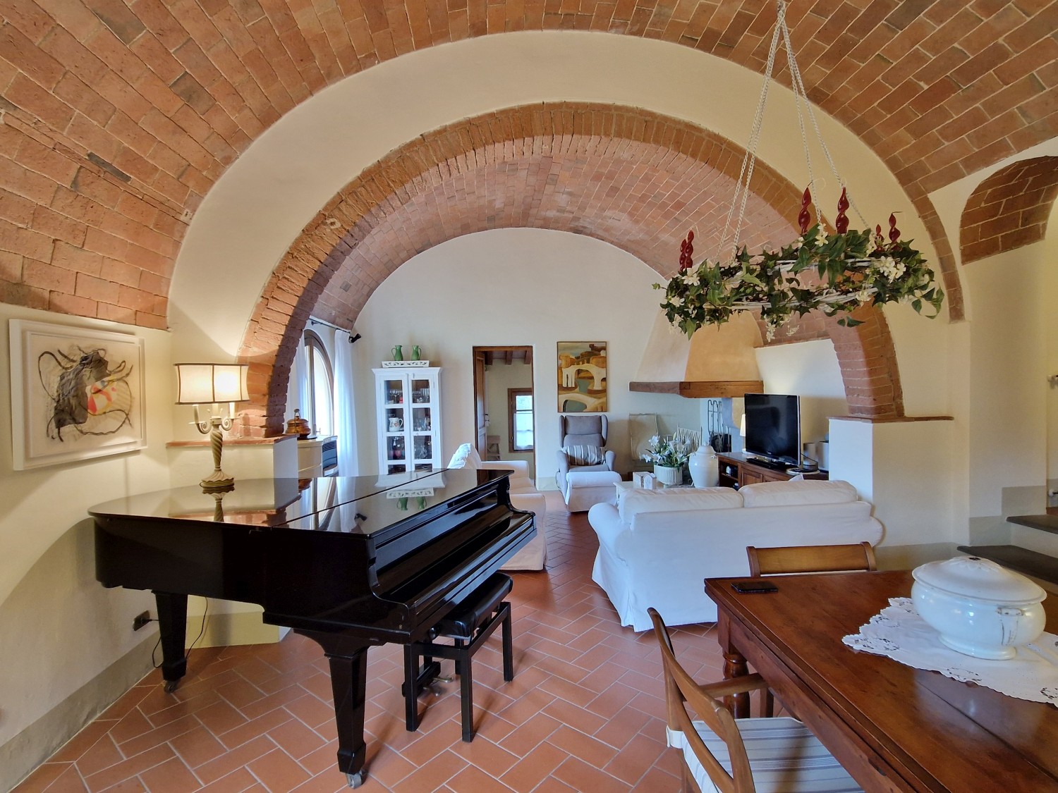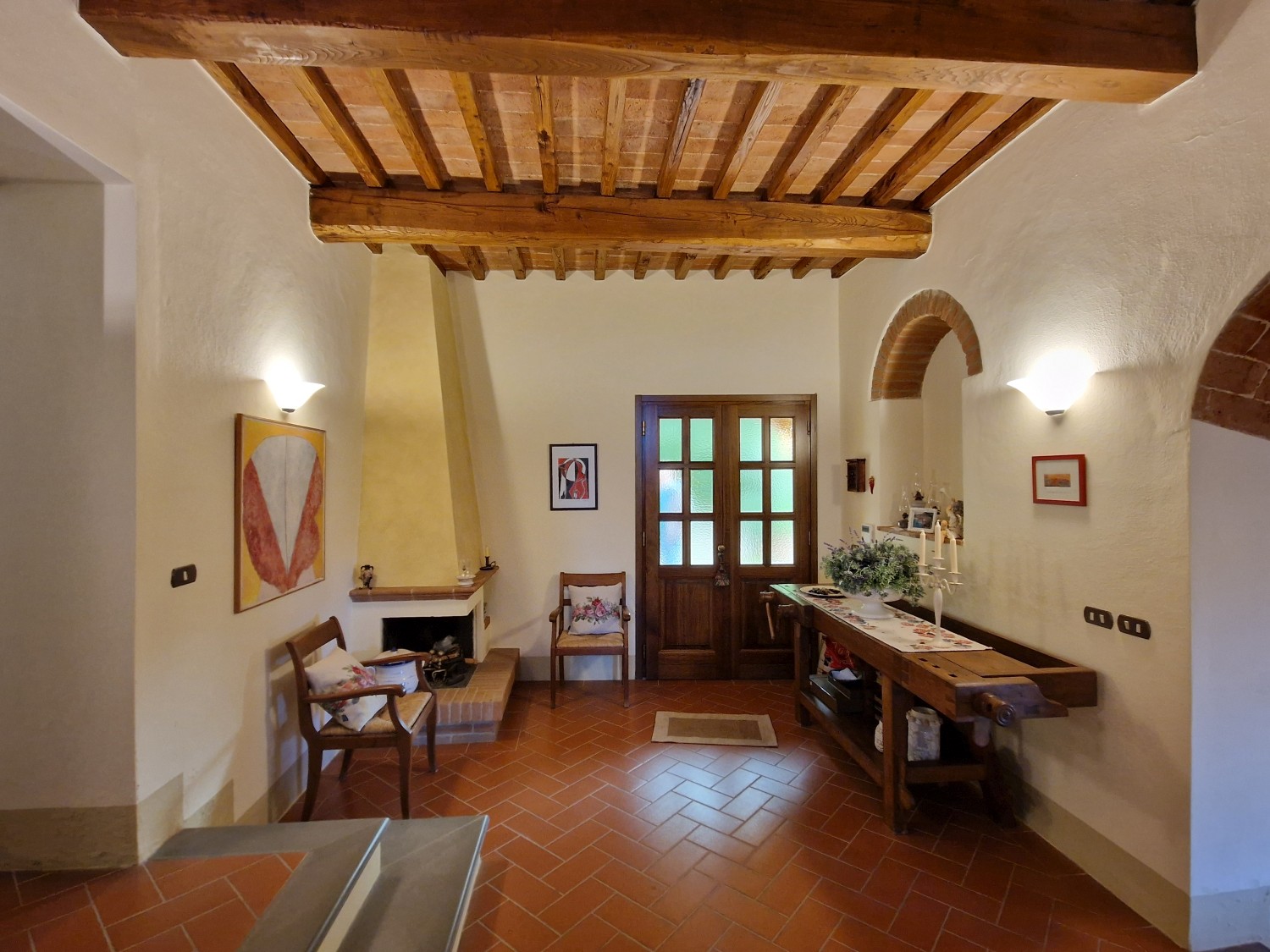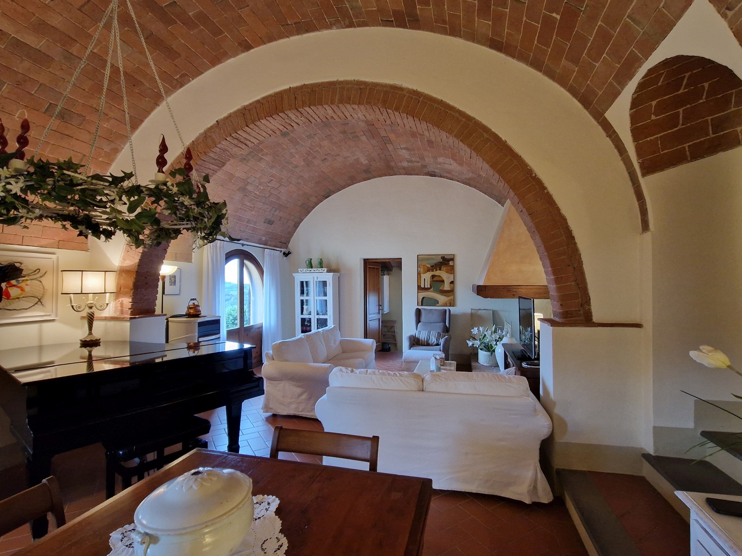 Das Obergeschoss besteht aus: einem großen Wohnbereich mit Kamin und Küchen-/Essbereich, 4 Schlafzimmern und 3 Badezimmern, mit Decken aus Kastanienholzbalken und -sparren und toskanischen Ziegeln sowie Terrakottaböden. Das Obergeschoss wird an Touristen durchschnittlich etwa 15 Wochen von Mai bis September über eine sehr gute einheimische Agentur vermietet. Das kann ausgebaut werden.