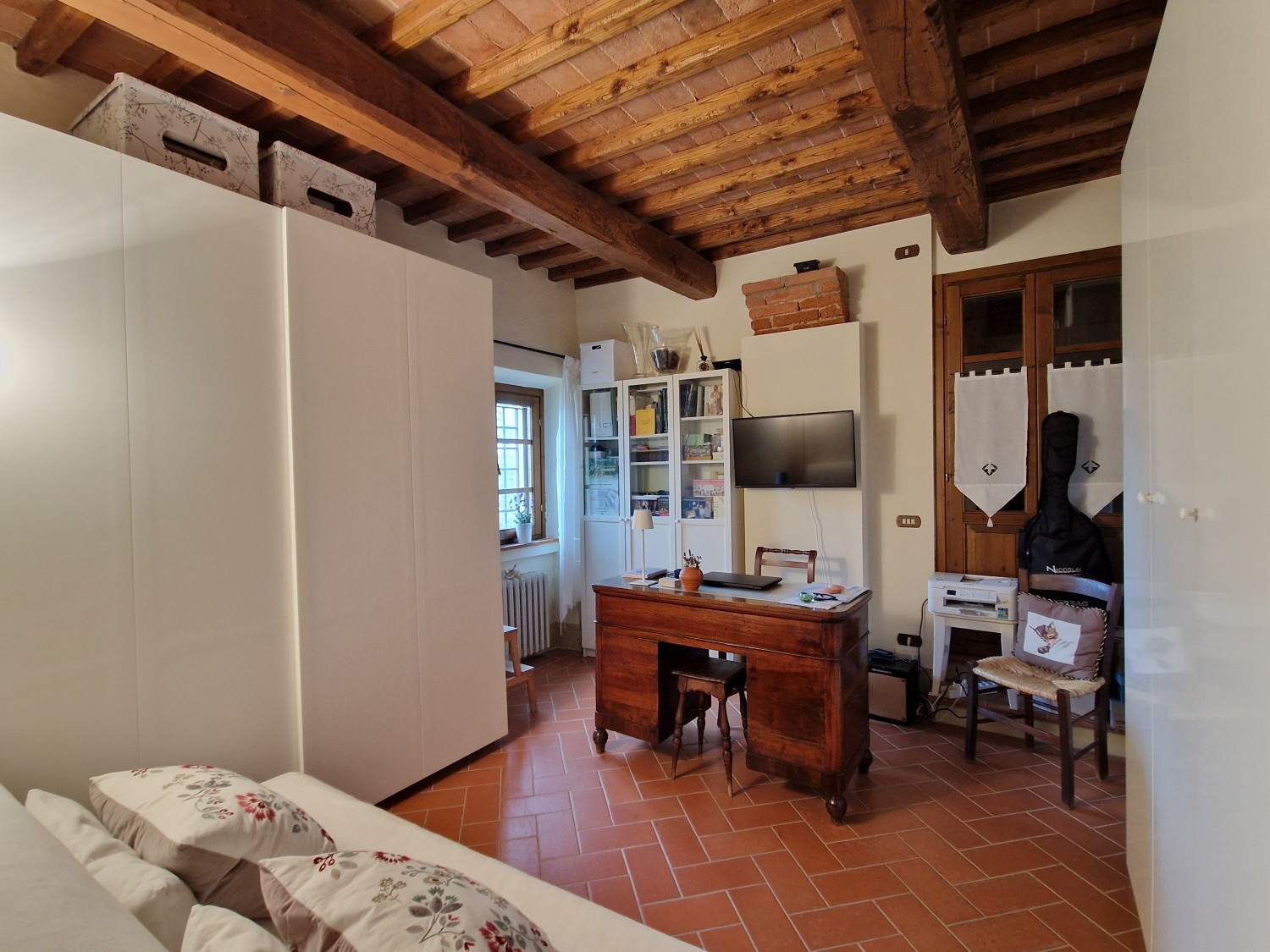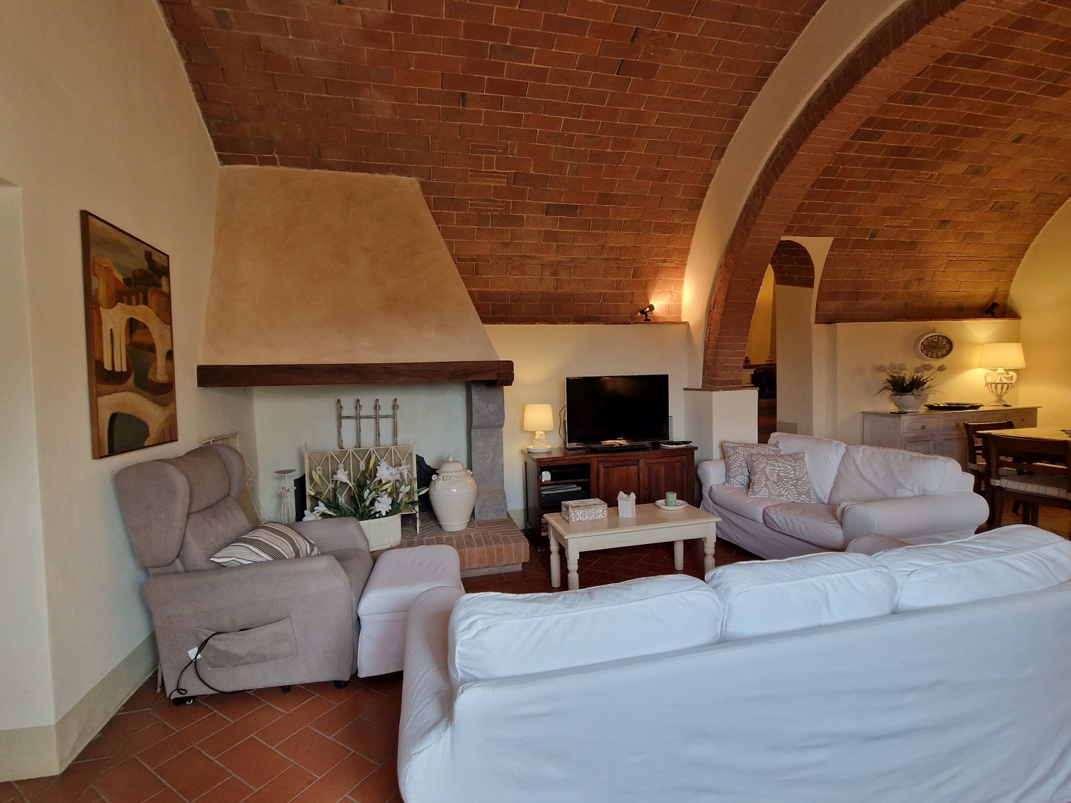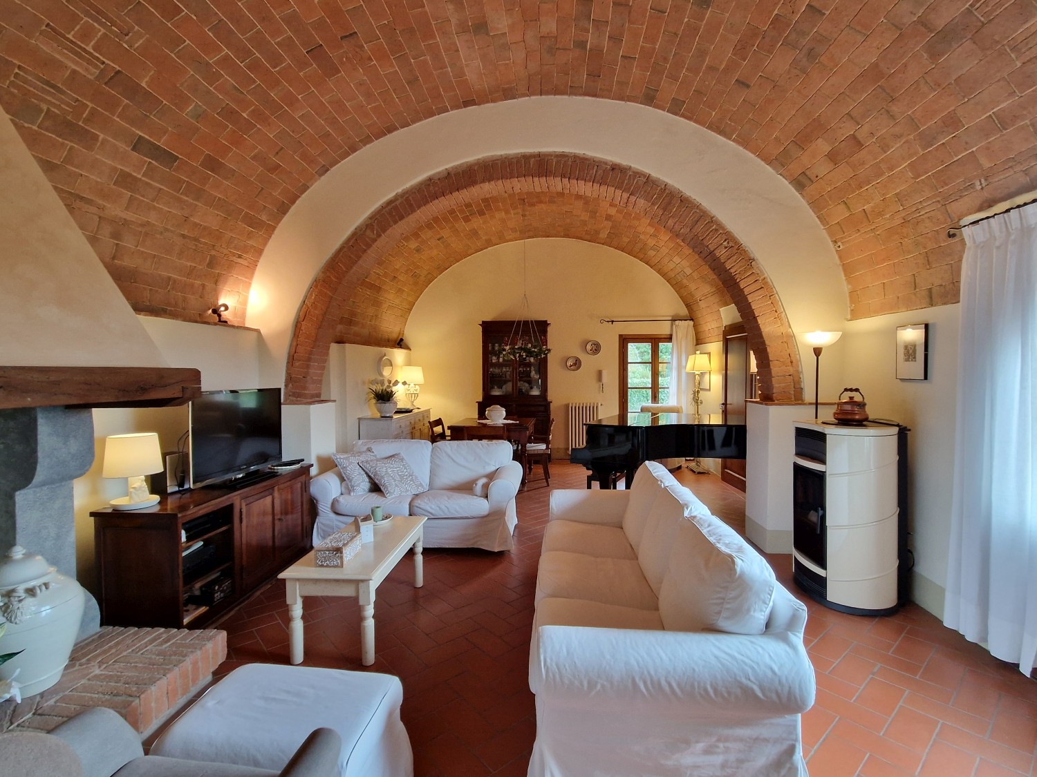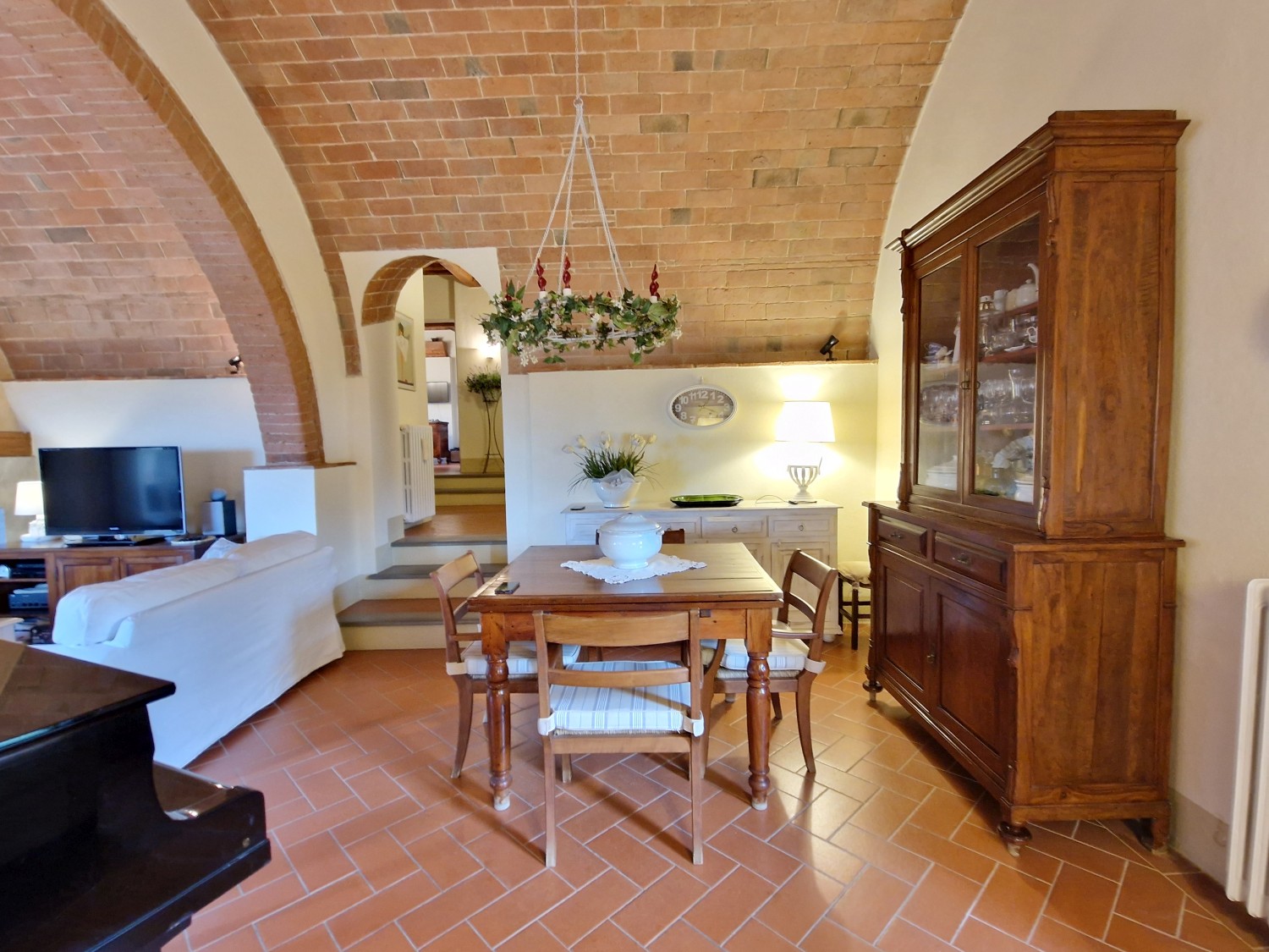 Das Obergeschoss besteht aus: einem großen Wohnbereich mit Kamin und Küchen-/Essbereich, 4 Schlafzimmern und 3 Badezimmern, mit Decken aus Kastanienholzbalken und -sparren und toskanischen Ziegeln sowie Terrakottaböden. Das Obergeschoss wird an Touristen durchschnittlich etwa 15 Wochen von Mai bis September über eine sehr gute einheimische Agentur vermietet. Das kann ausgebaut werden.