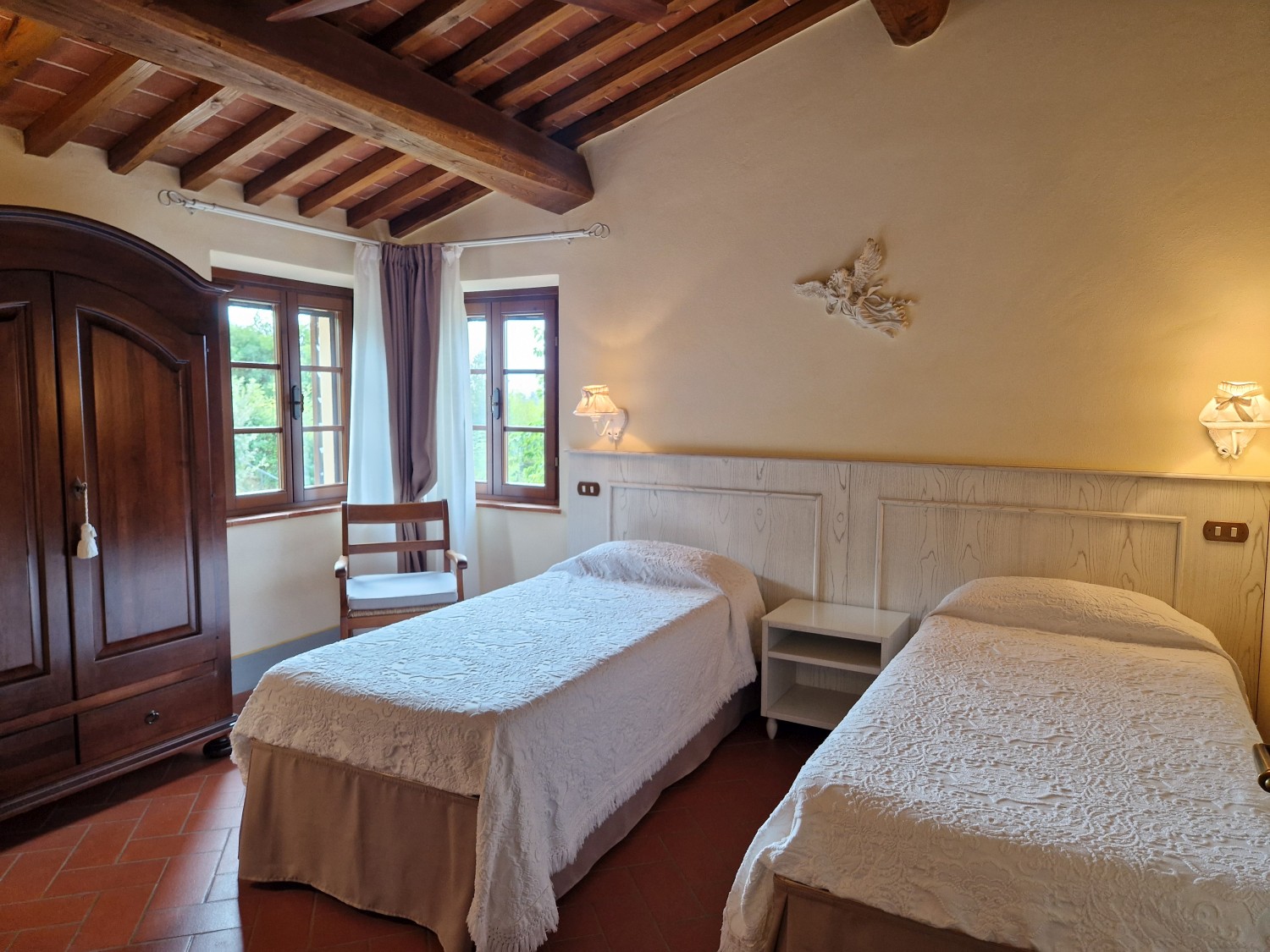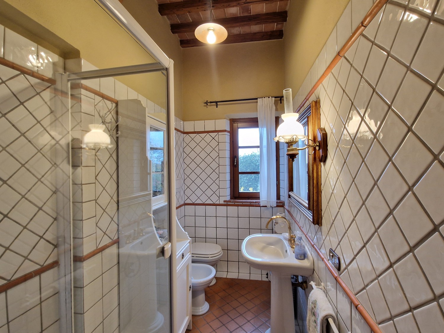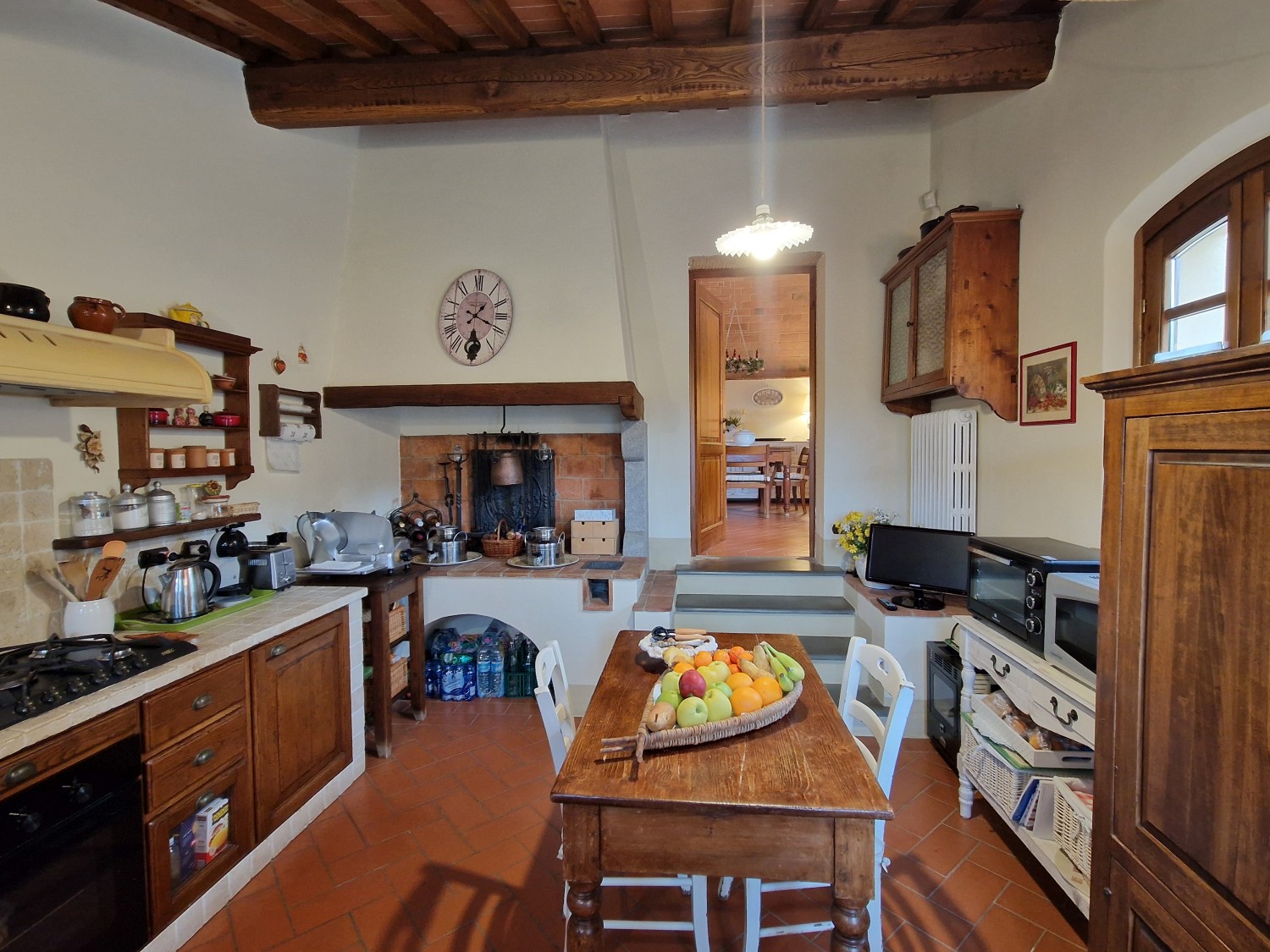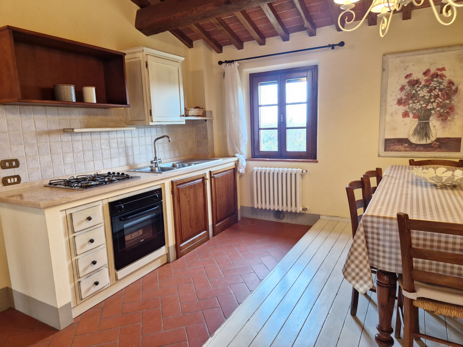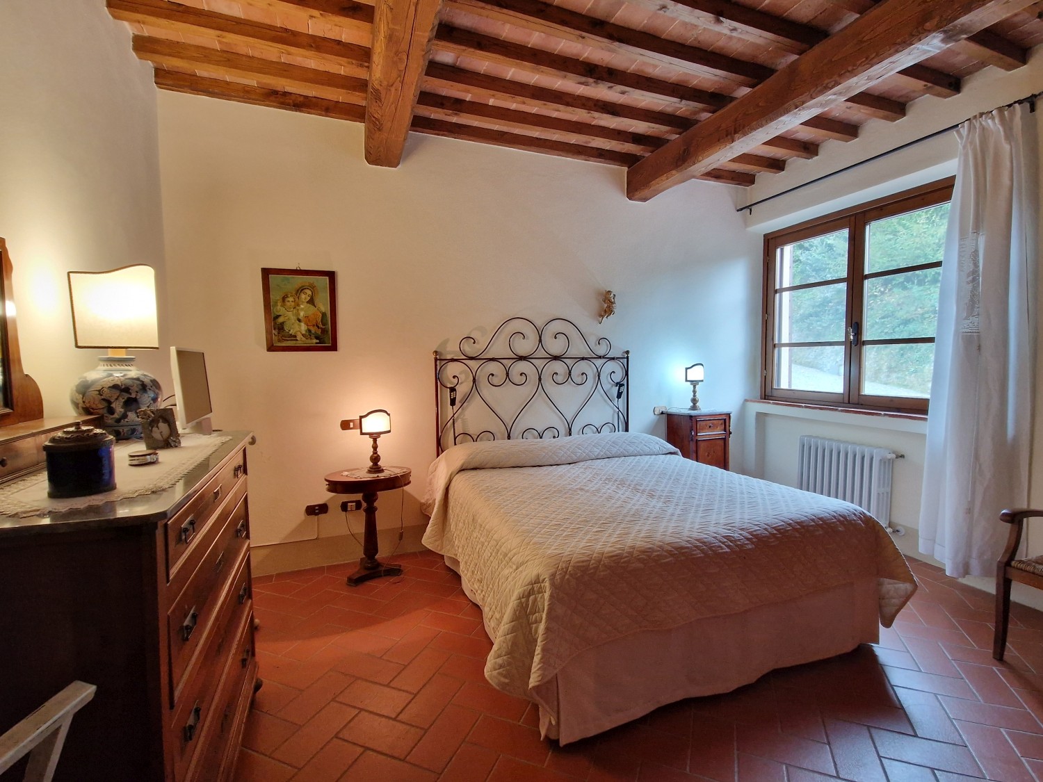 Das Obergeschoss besteht aus: einem großen Wohnbereich mit Kamin und Küchen-/Essbereich, 4 Schlafzimmern und 3 Badezimmern, mit Decken aus Kastanienholzbalken und -sparren und toskanischen Ziegeln sowie Terrakottaböden. Das Obergeschoss wird an Touristen durchschnittlich etwa 15 Wochen von Mai bis September über eine sehr gute einheimische Agentur vermietet. Das kann ausgebaut werden.