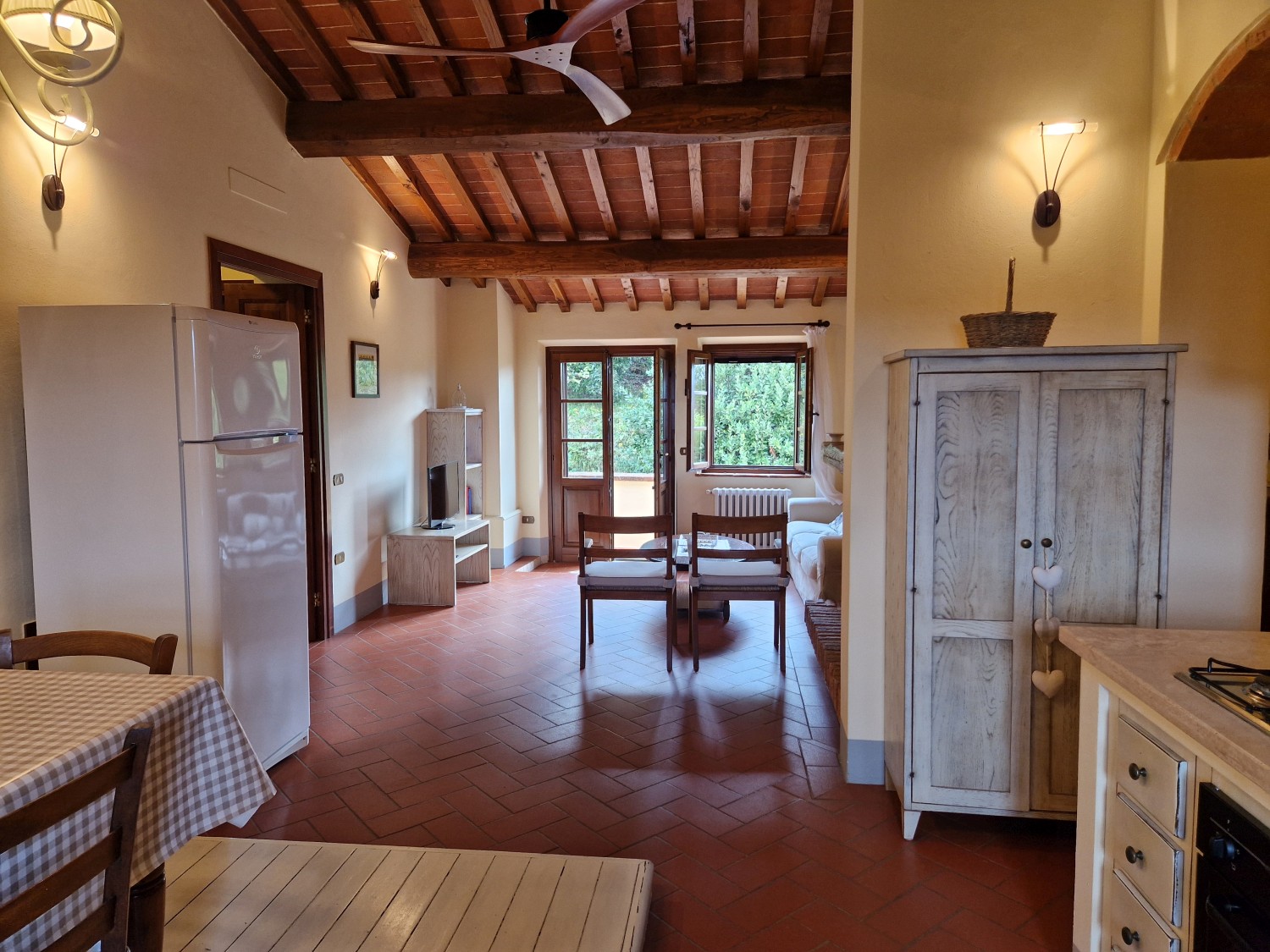 Das Erdgeschoss hingegen besteht aus: einem großen Wohnzimmer mit Gewölbedecke (ehemaliger Stall) mit Kamin, einer Küche/Esszimmer mit gemauerter Küche, 1 Doppelzimmer, 1 Badezimmer, 1 Arbeitszimmer. Eine während der Renovierung erbaute Innentreppe ermöglicht es, die beiden Stockwerke zu verbinden, indem einfach die Holzplattform entfernt wird, die sie derzeit trennt.