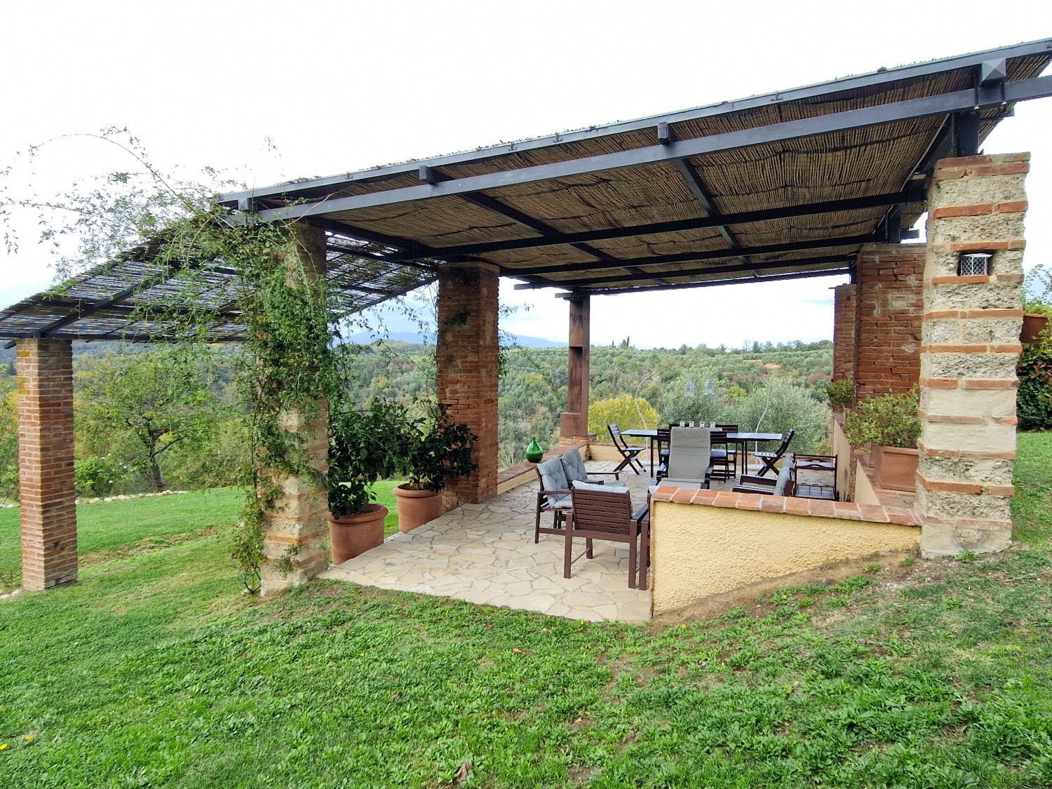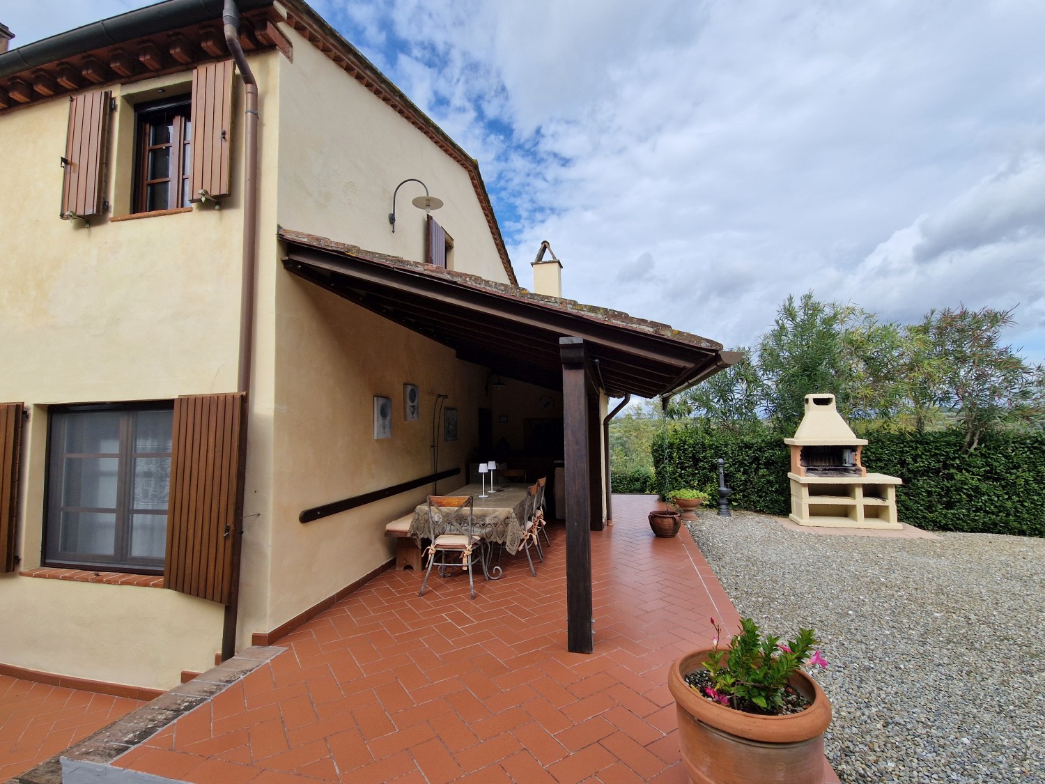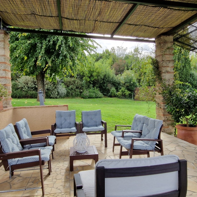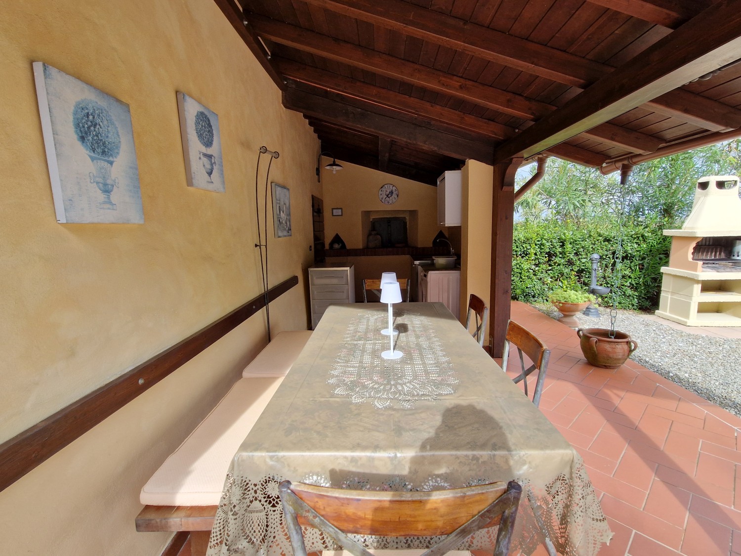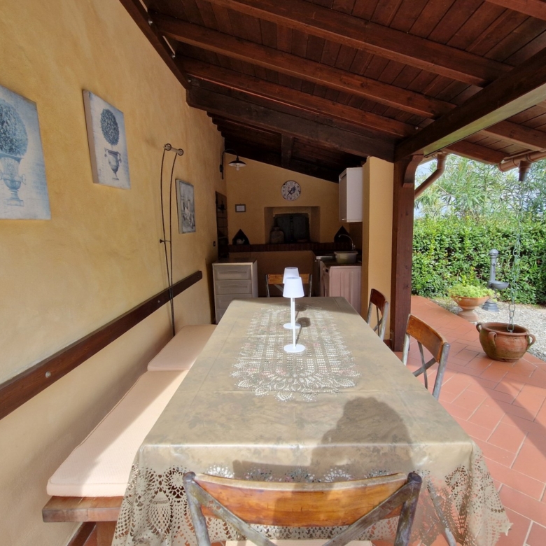 Im Außenbereich des Hauses befinden sich ein Grill, ein überdachter Bereich mit Kühlschrank, Kochfeld, Spüle, Waschmaschine und einem voll funktionsfähigen gemauerten Holzofen. Auf der anderen Seite befindet sich ein weiterer überdachter Bereich, der auf den Ziegelsäulen einer ehemaligen Scheune aus dieser Zeit errichtet wurde, die verfallen war.