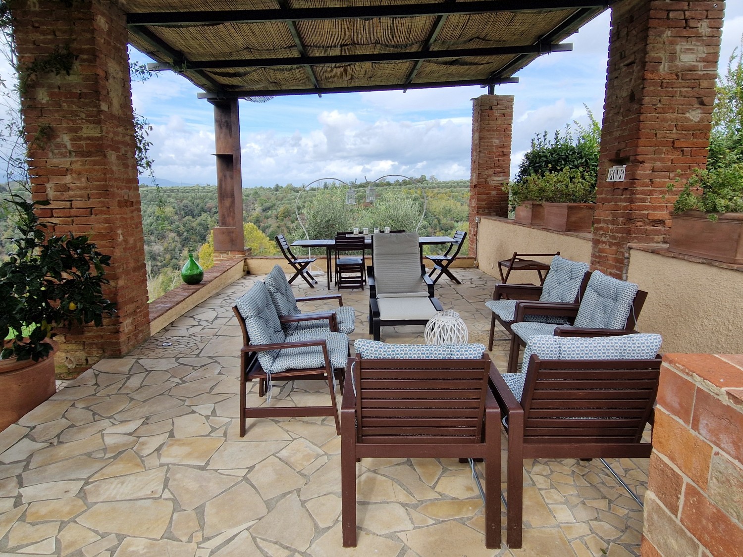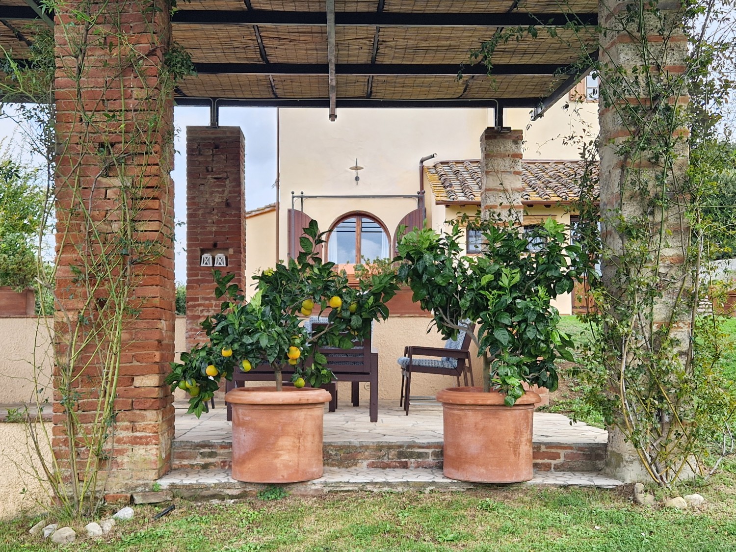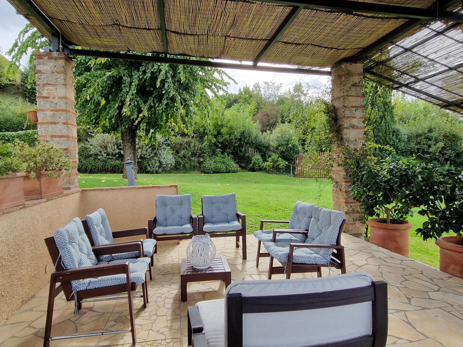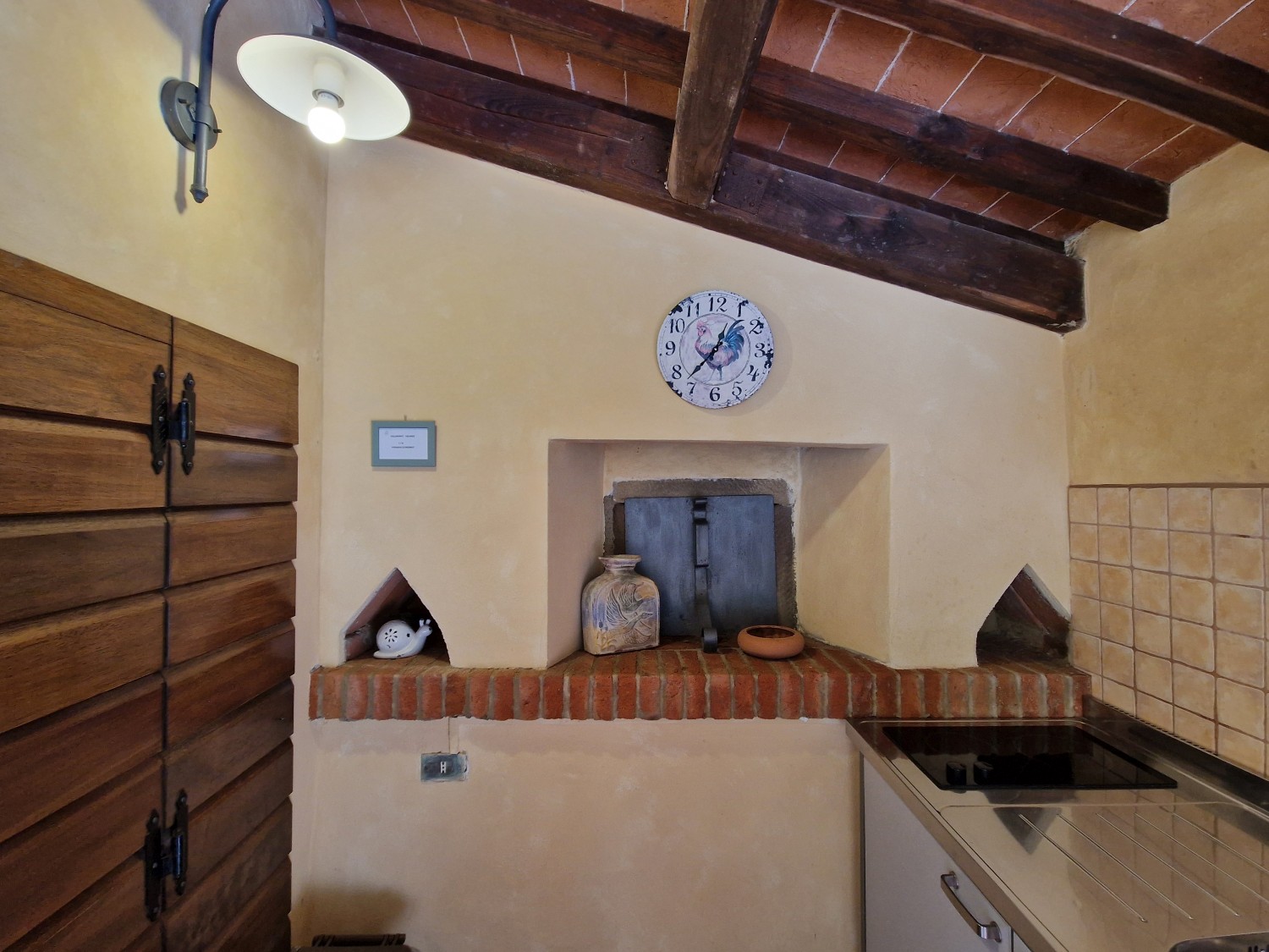Im Außenbereich des Hauses befinden sich ein Grill, ein überdachter Bereich mit Kühlschrank, Kochfeld, Spüle, Waschmaschine und einem voll funktionsfähigen gemauerten Holzofen. Auf der anderen Seite befindet sich ein weiterer überdachter Bereich, der auf den Ziegelsäulen einer ehemaligen Scheune aus dieser Zeit errichtet wurde, die verfallen war.