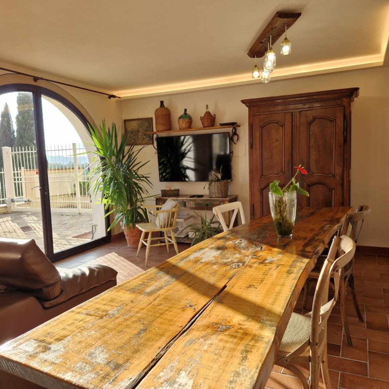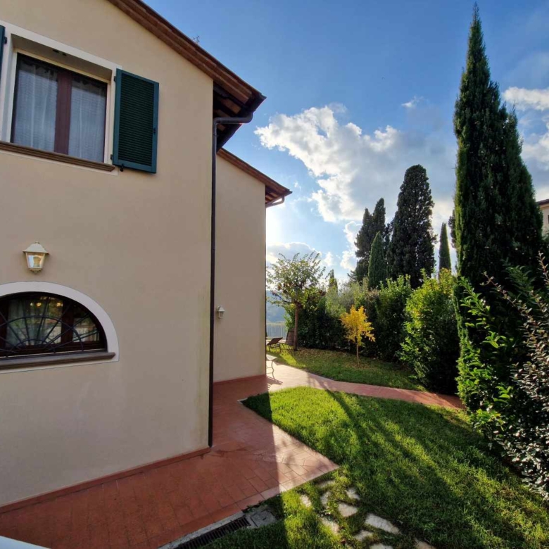 Diese moderne toskanische Villetta in Einzellage mit 175 qm und 300 qm Garten in der Weingegend um Terricciola (Provinz Pisa), äußerst geschmackvoll eingerichtet, befindet sich am Rande eines kleinen Dörfchens mit wunderbarem Blick in die Hügel mit Ausrichtung West/ Sonnenuntergang/ Meer. Sie liegt eingebettet in eine Reihe von Häusern, bietet jedoch durch die raffinierte Art ihrer Gestaltung mit mediterraner Vegetation und Sichtschutz sehr viel privacy. Sie liegt ein paar Meter entfernt von einer Straße, die mehrere Dörfer miteinander verbindet. Diese ist nicht sehr befahren, man hört sie im vorderen Bereich, hinten und im Haus sind komplette Ruhe und Frieden. Es gibt Platz für einen kleinen Pool oder Whirlpool. Gute Erreichbarkeit aller Kunst- und Kulturstädte der Toskana.